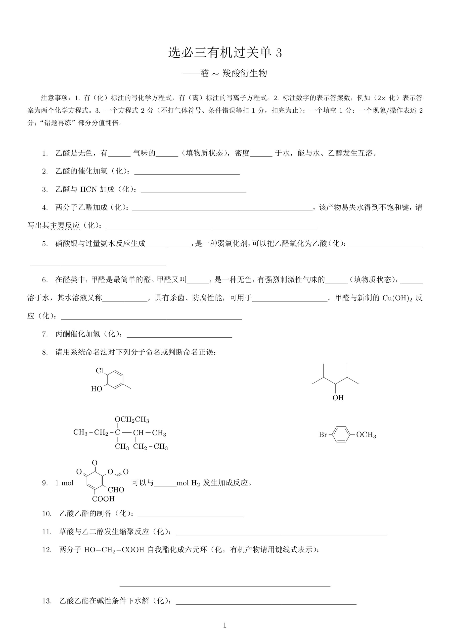 \title{\vspace{-2em}选必三有机过关单3\vspace{-1em}}