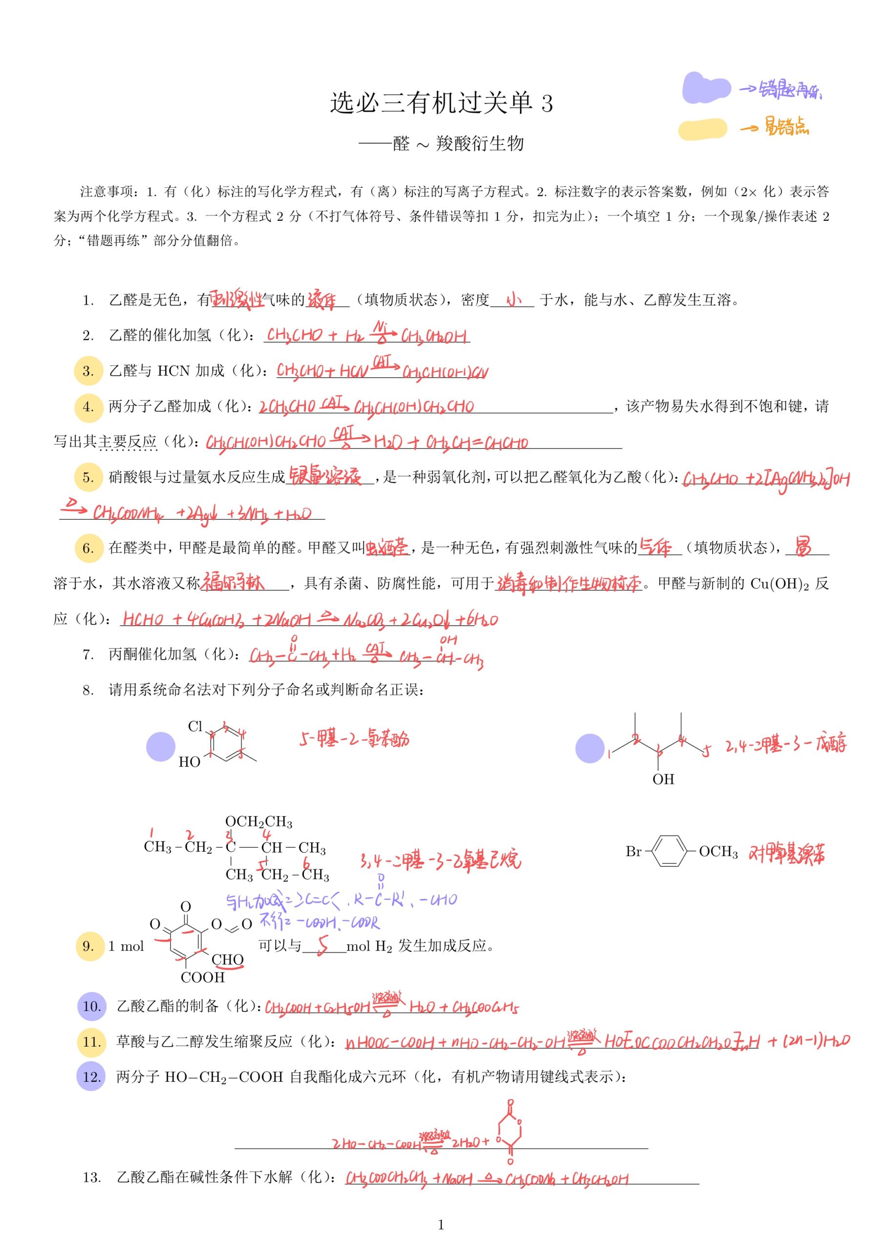 3. 一个方程式2分(不打气体符号、条件错误等扣1分,扣完为止);一个填空1分;一个现象/操作表述2分;“错题再练”部分分值翻倍。